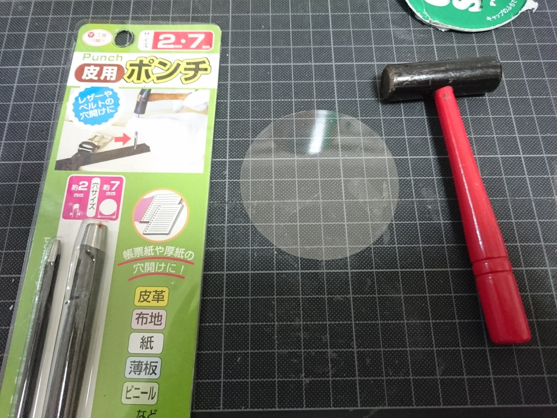 穴あけポンチ、穴を開けるのに重宝、ダイソーの8mmを使ってます。