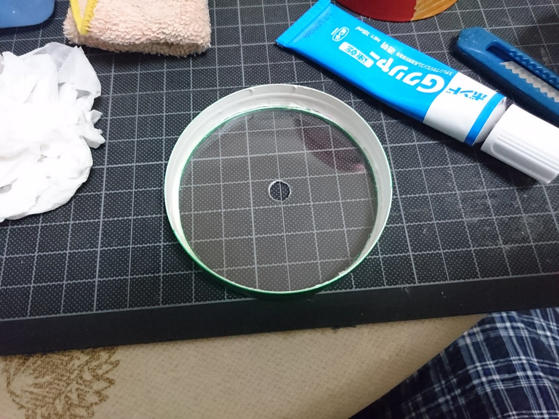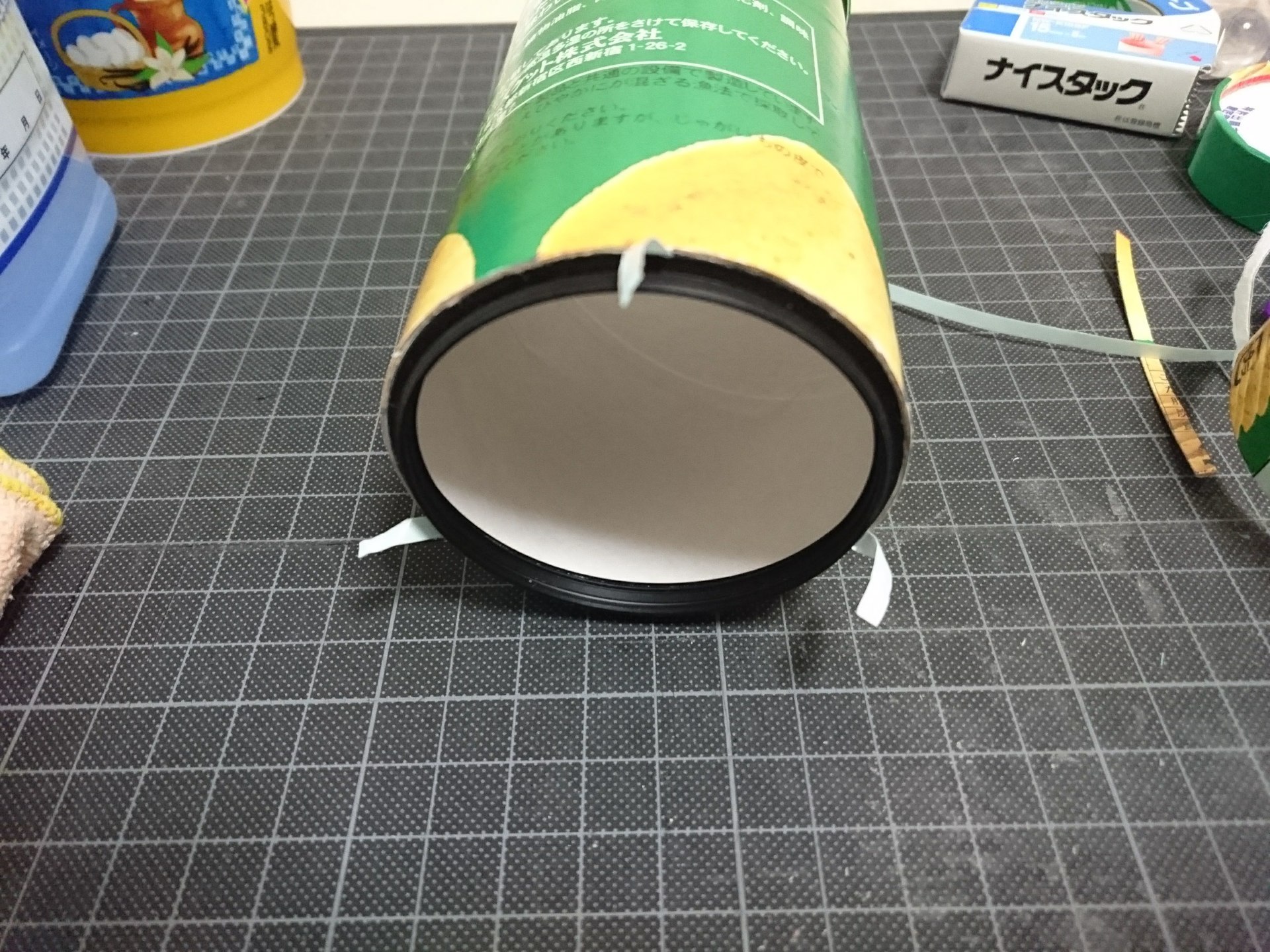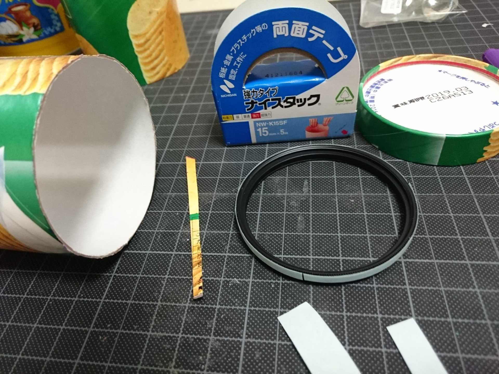 透明な板、アクリル板がおススメだが、今回はヨーグルトの蓋を利用した、ソフトフォーカス状態になるのでスマホならプリングルスの蓋程度の透明度でもあり(スマホ用はそれで作った)