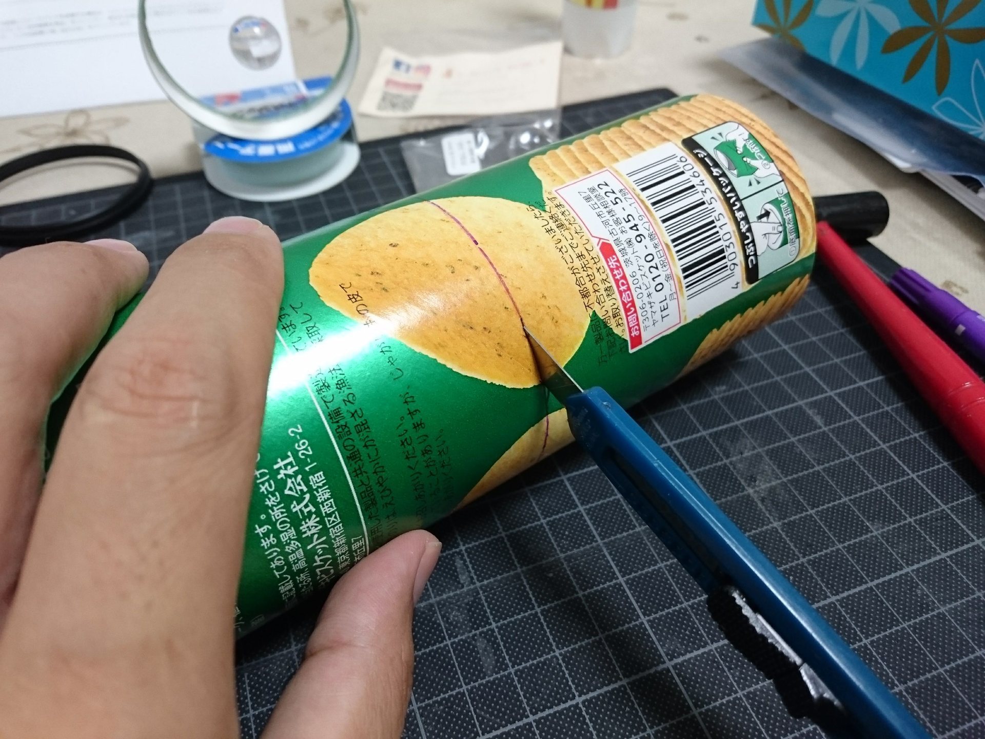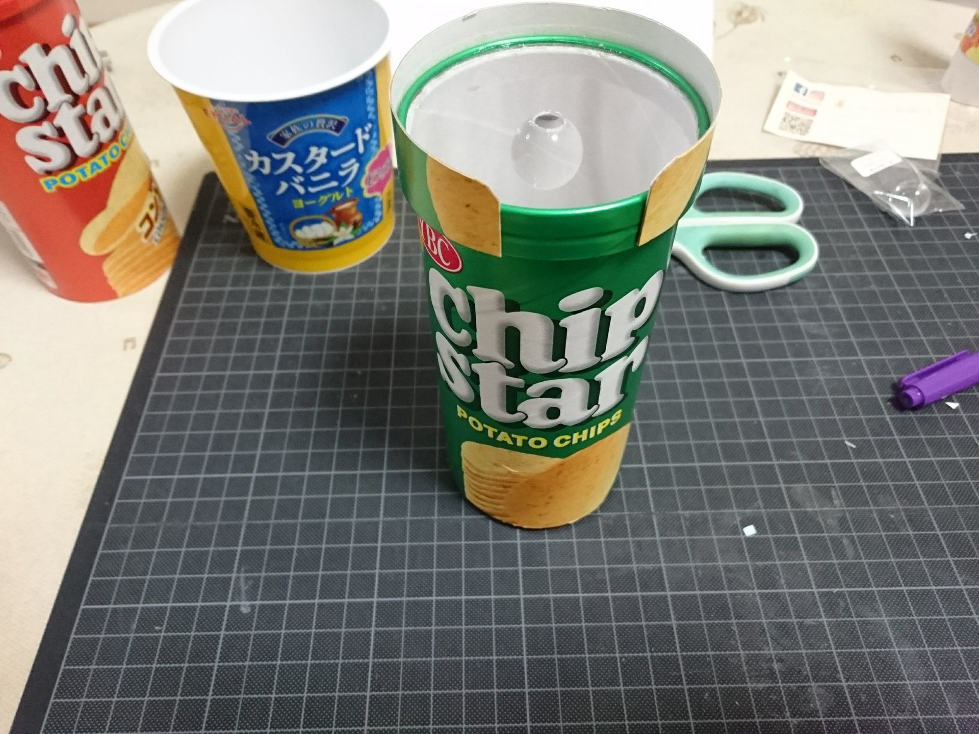 カスタードバニラヨーグルトの蓋を加工します。ポテチの内筒と同じサイズに切り抜きます。