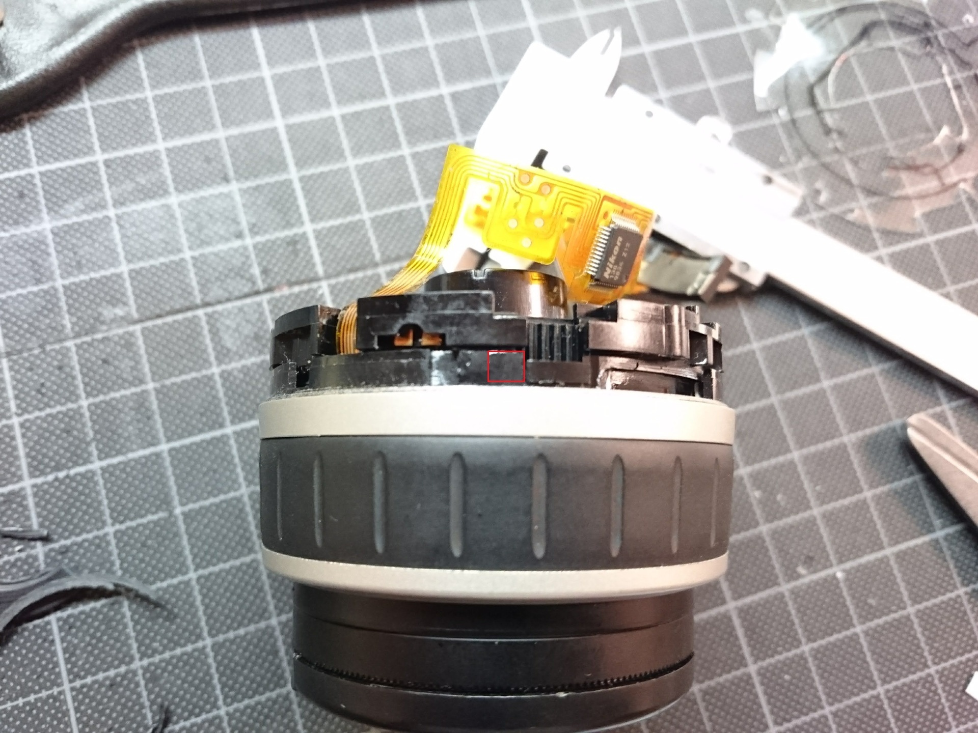 IX-Nikkor 24-70mmもそうですが、マウントの裏側に絞りの部品のマウント的なリングが付いており、その部品に基盤が干渉してました。